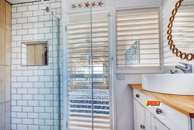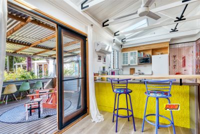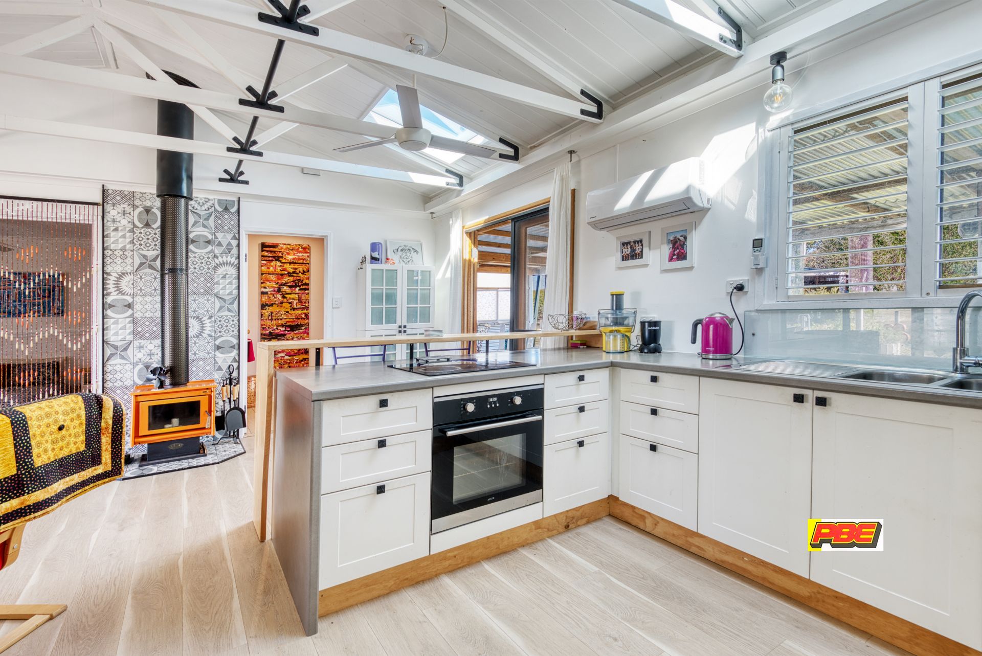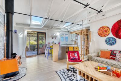 The home's striking timber-lined raked ceilings, paired with two Velux skylights, fill the space with natural light and enhance the coastal feel. A stylish wood heater and split system ensure year-round comfort, keeping you cozy in winter and cool in summer.