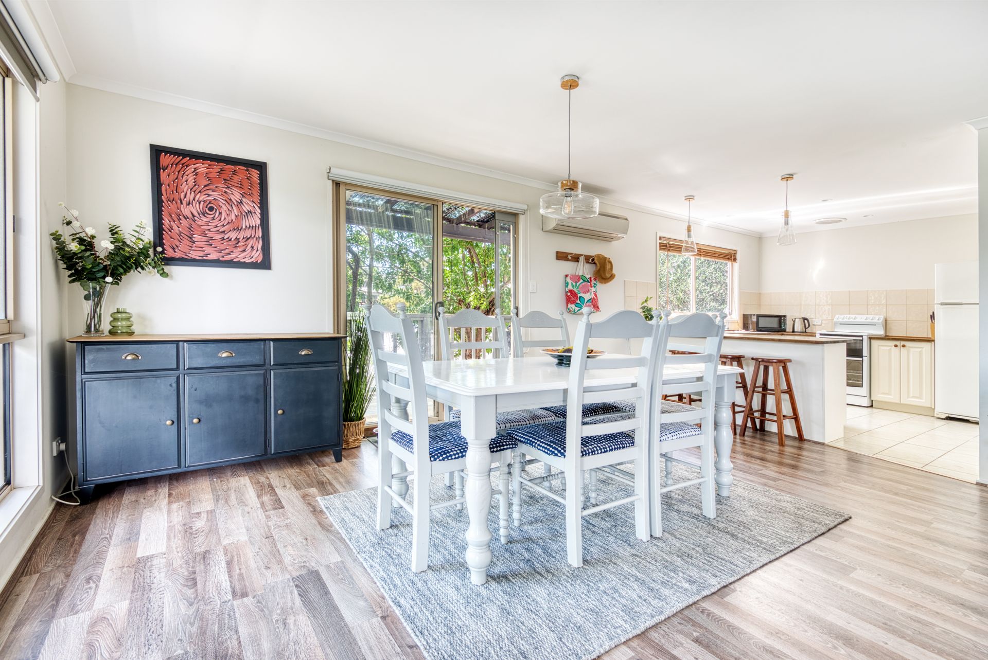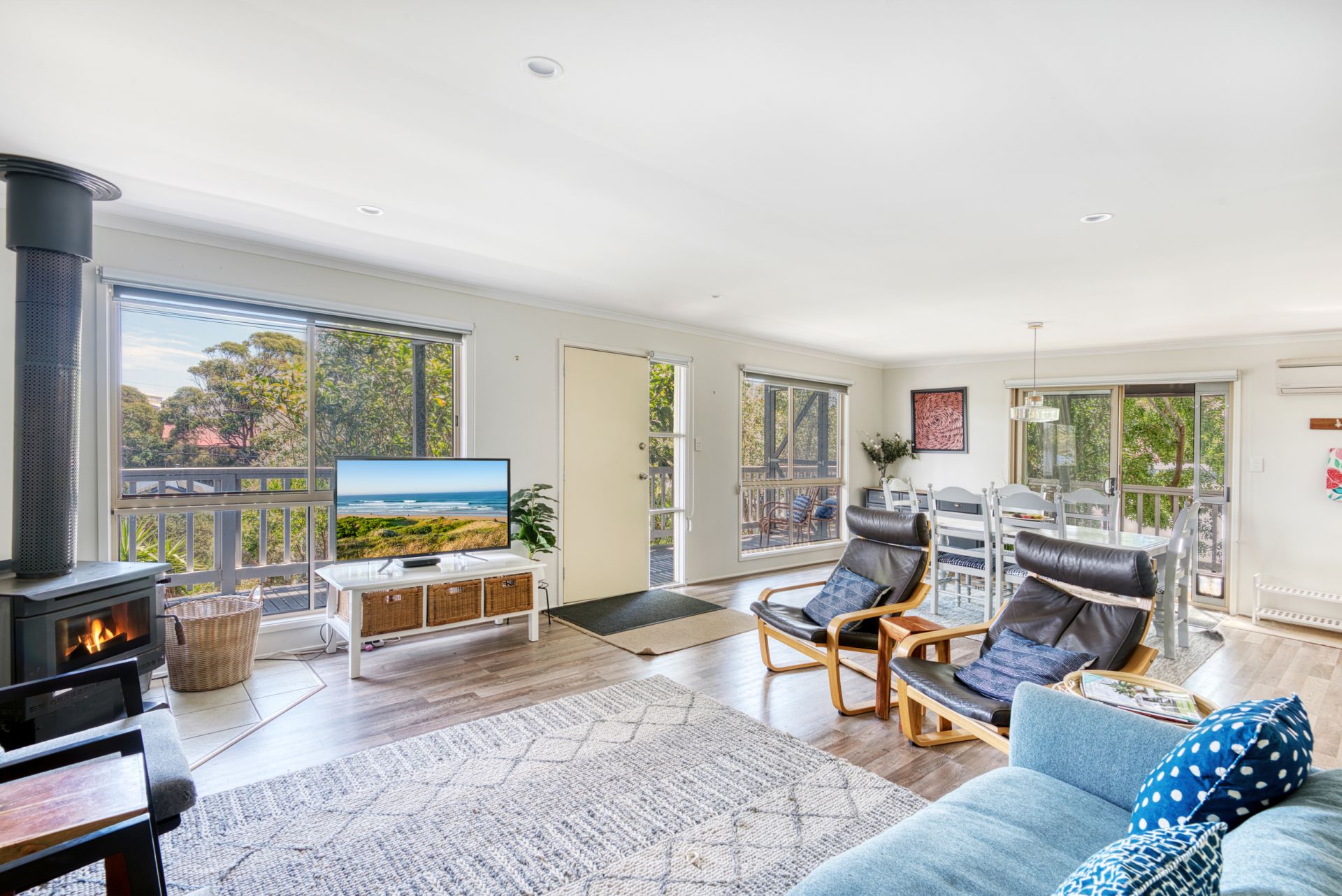 Entering the home you will be impressed with the spacious, light filled living area offering a glass sliding door to the under cover decking and front veranda. This area is ideal for that lazy Sunday breakfast or evening BBQs with friends after a sun filled day at the beach. The kitchen has been updated with attractive timber beach tops, a dishwasher and has plenty of storage. Timber look floors add to that beachy feel whilst the wood heater and RC aircon give year round comfort. The downstairs floor plan is completed by a separate laundry and toilet.