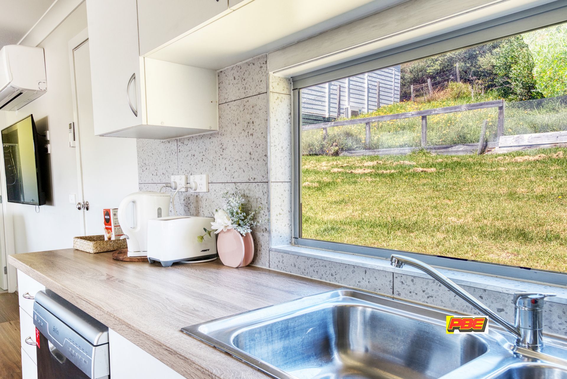 The kitchen is not only aesthetically pleasing but also practical, boasting ample storage, modern appliances, and a feature window overlooking the lush green backyard.