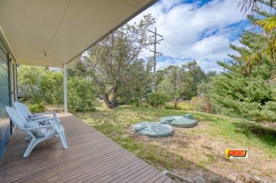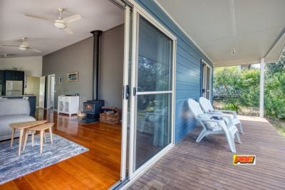 An open plan living area greets you with large double glazed windows and doors, hardwood floors and raked ceilings. An R/C aircon and wood heater set the scene for year round comfort while the kitchen offers plenty of storage and electric appliances.